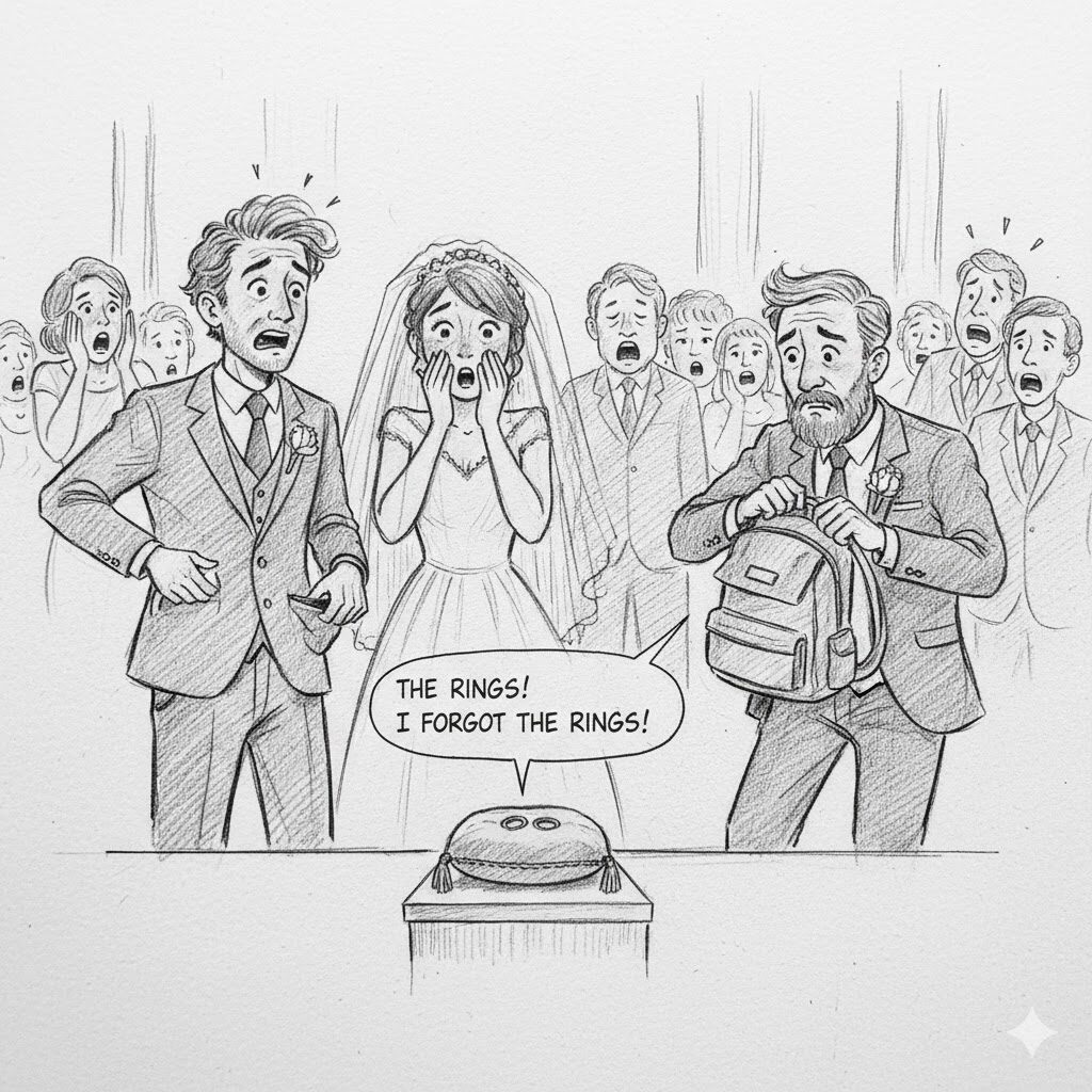 Yep, it happens. You’re standing there, music fading, everyone smiling, and I say, “May I have the rings?” Then the Best Man gives me that panicked look — you know the one — and starts patting every pocket he owns. Meanwhile, the Maid of Honor suddenly looks like she’s doing mental math trying to remember if she saw them in the bridal suite.